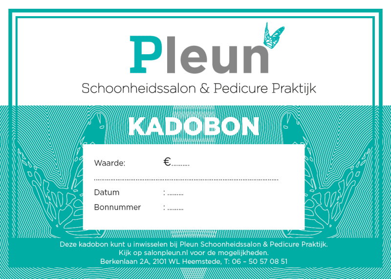 Ben jij op zoek naar een origineel cadeau? Geef een cadeaubon van Salon Pleun! Cadeaubonnen zijn verkrijgbaar in elk gewenst bedrag of behandeling en worden geleverd in een luxe verpakking. Leuk om te geven, maar ook leuk om te krijgen! Cadeaubonnen kun je bij ons ophalen of door ons per post laten versturen.